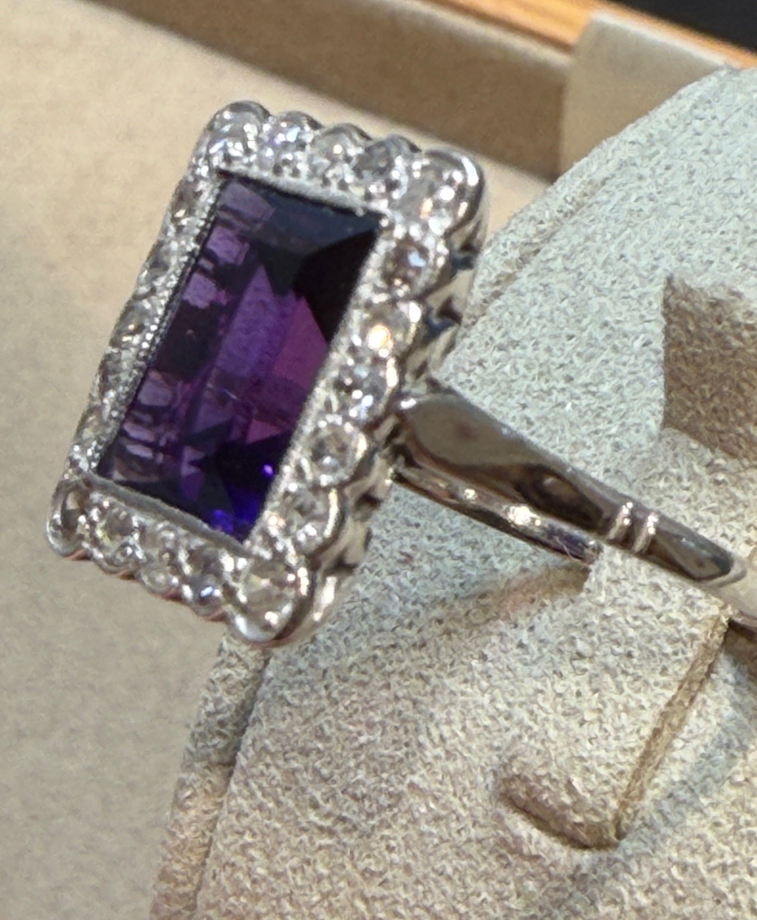 Délicate bague Art Déco en or blanc ornée d'une améthyste à pans coupés en serti clos dans un entourage de petits diamants également en serti clos formant une bordure festonnée.