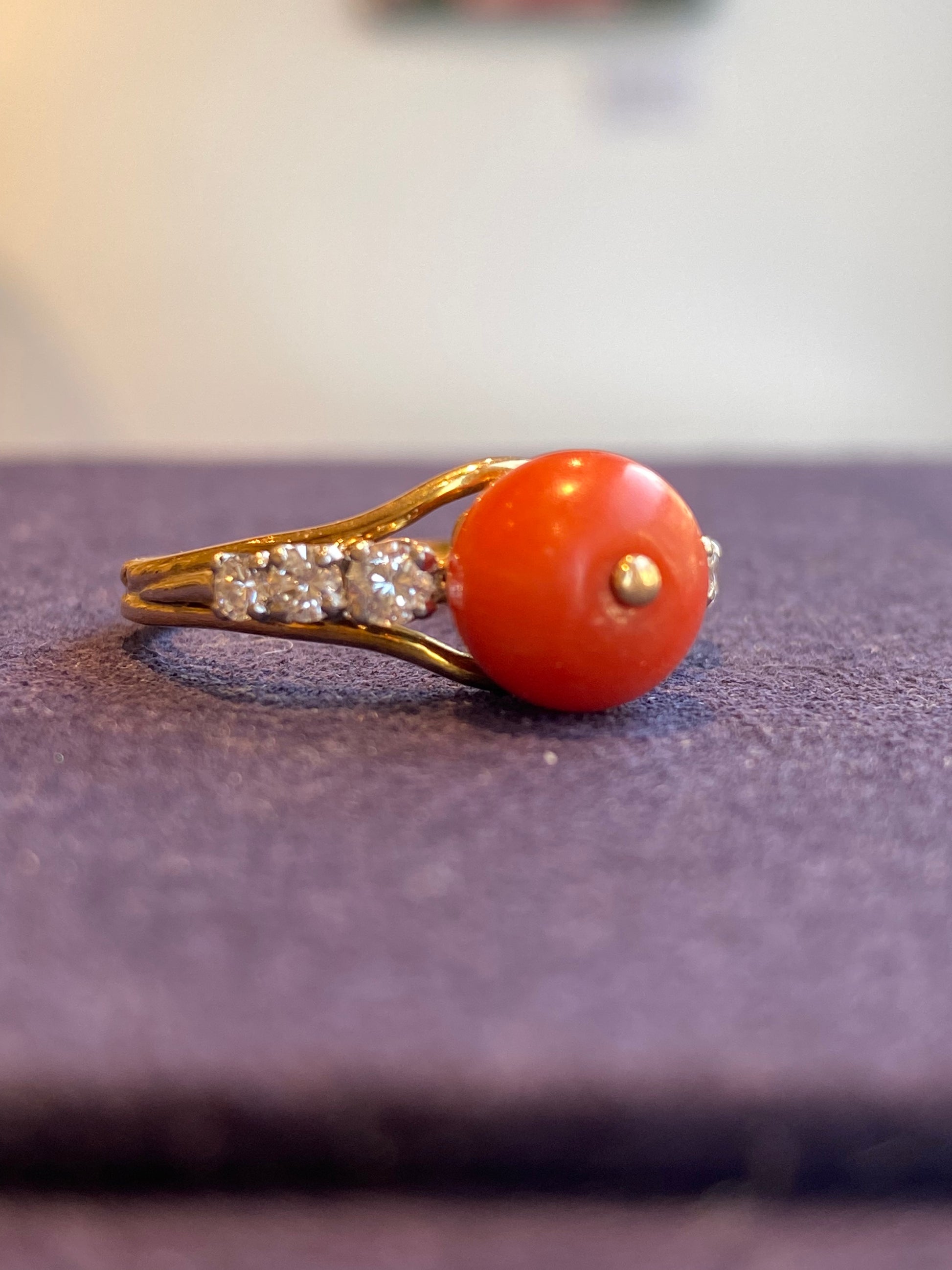 Antique rose gold ring adorned with a coral pearl flanked on either side by a line of brilliant-cut diamonds mounted on platinum.