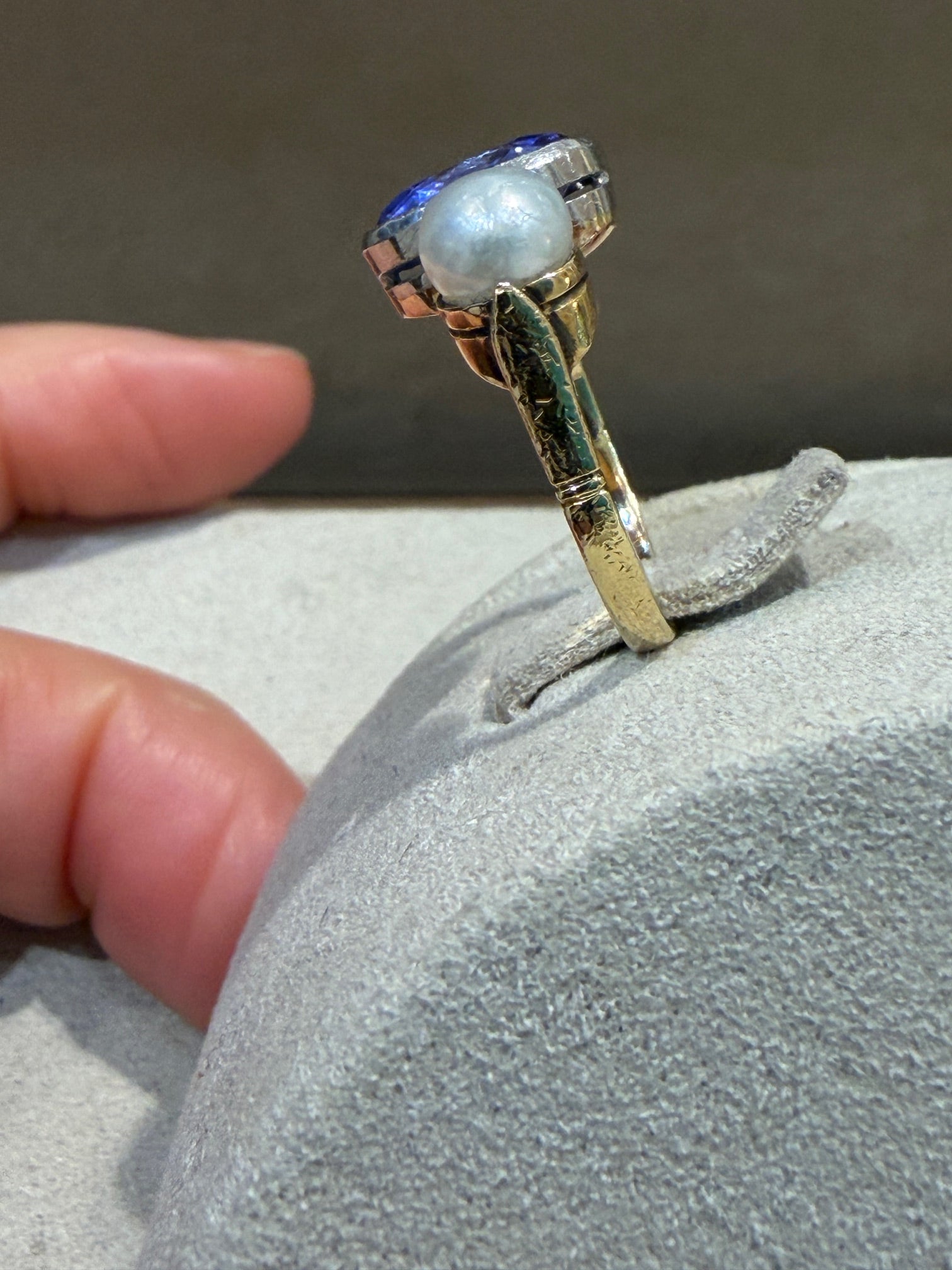 Stones: oval-cut sapphire (approx. 0.30 carats) and two cultured pearls.