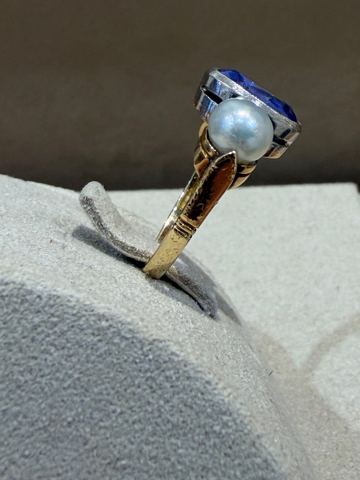 Delicate antique gold ring featuring an oval-cut sapphire in a bezel setting flanked by two cultured pearls.