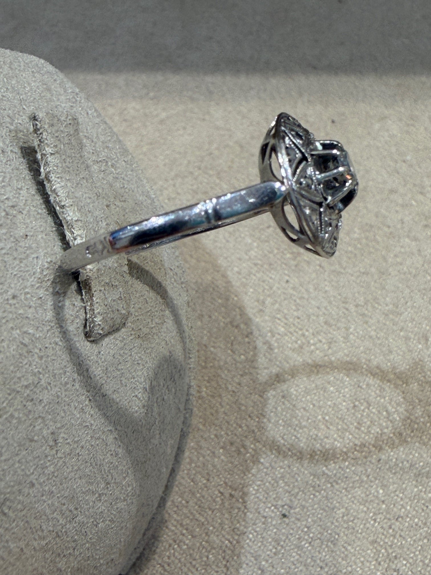 Bague Art Déco en or gris et platine de forme ronde à motif de fleur étoilée ciselée ornée en son centre d'un diamant en serti griffes.