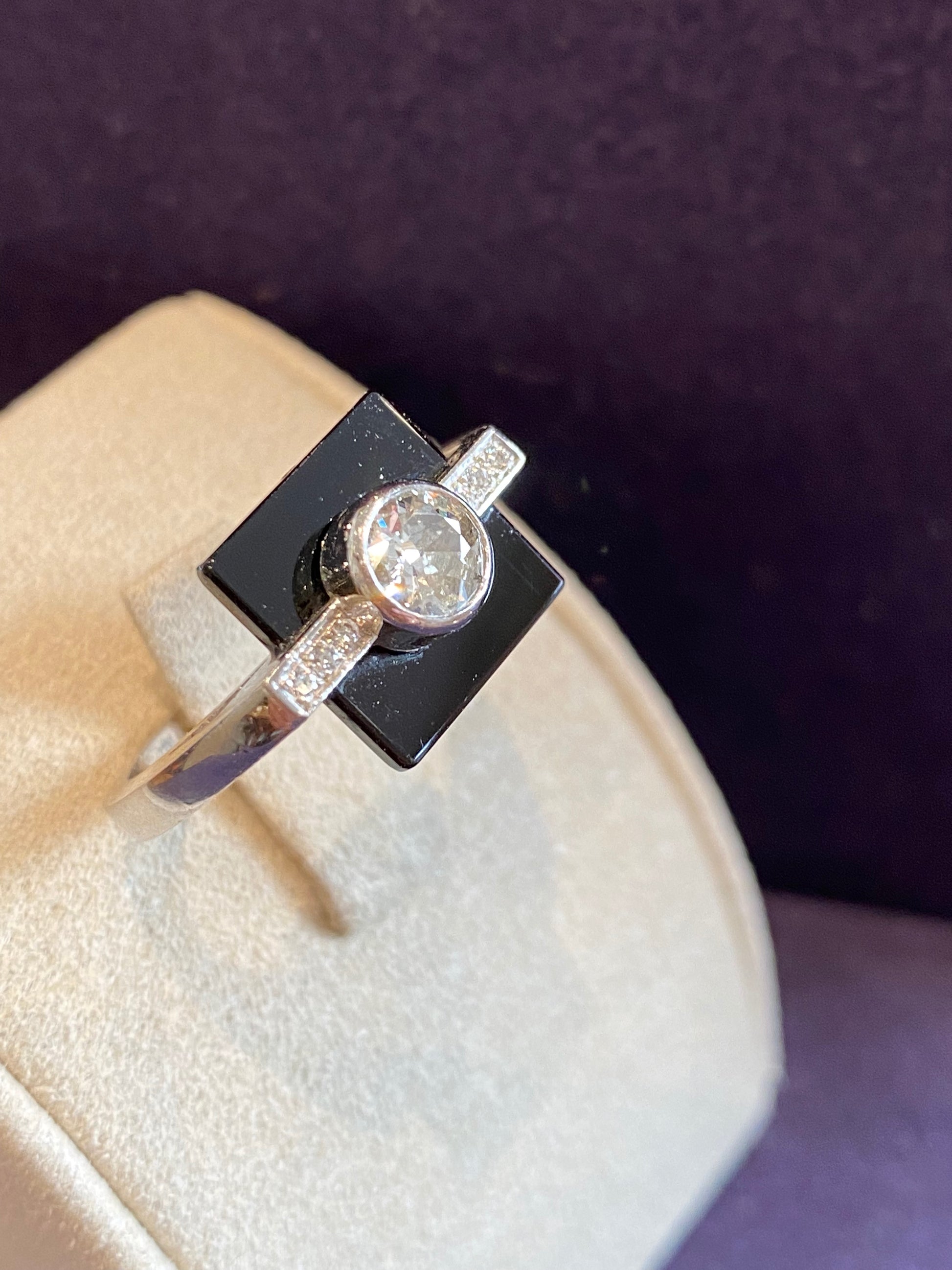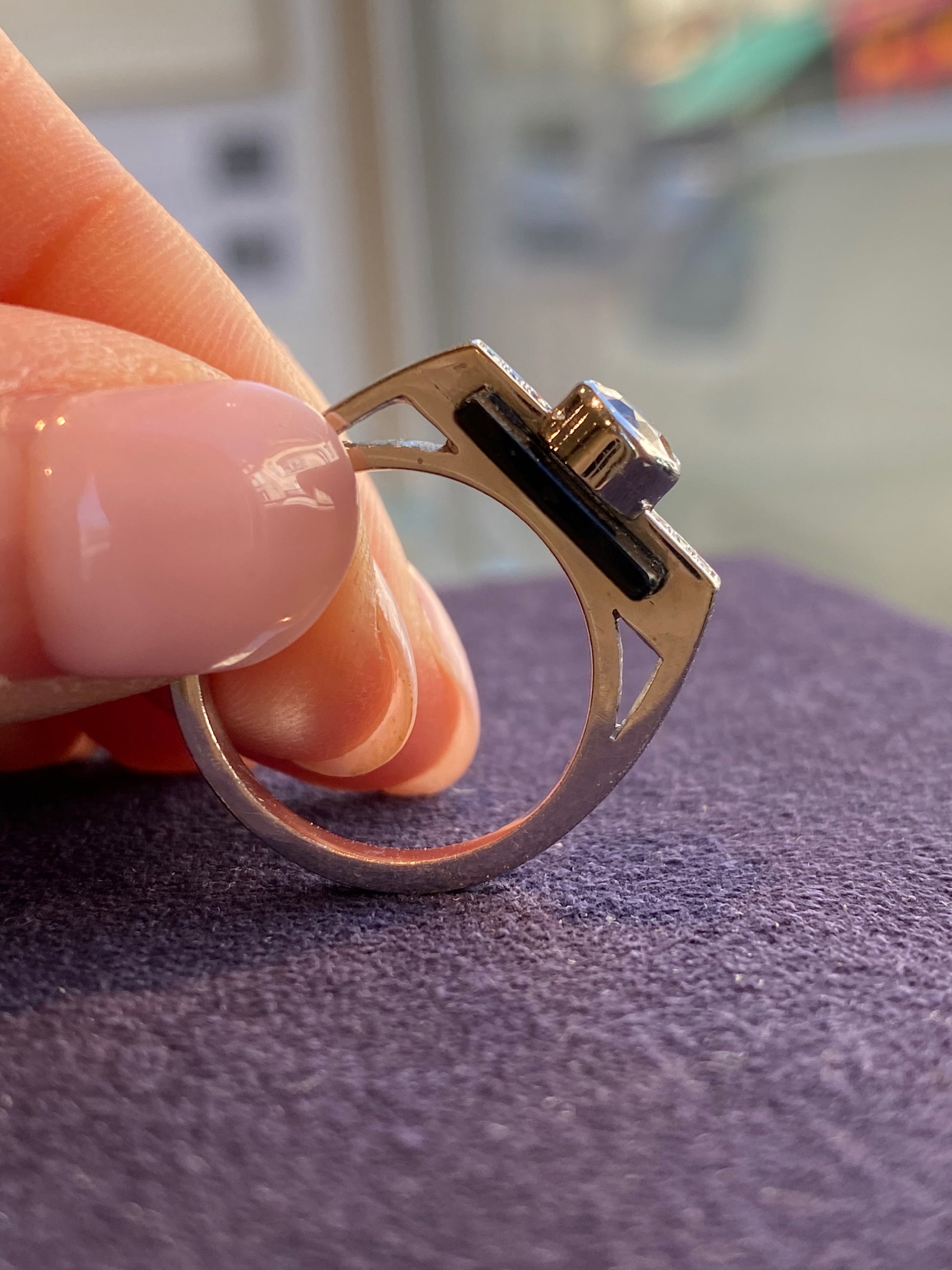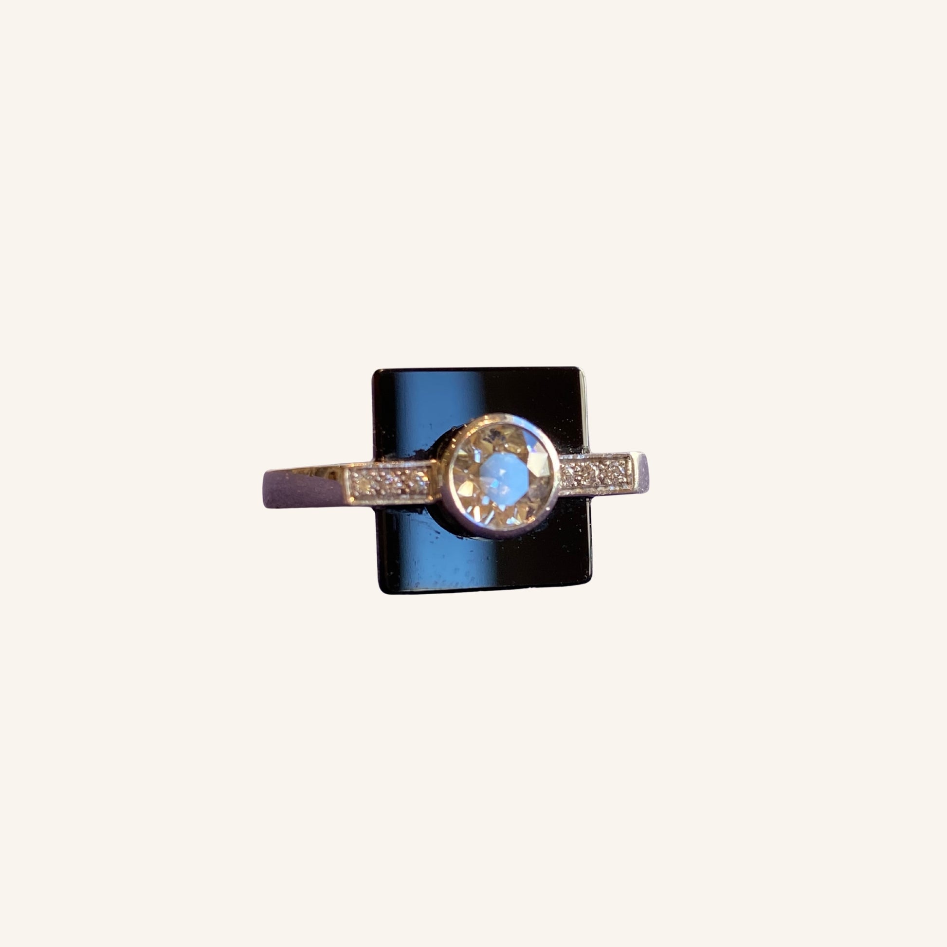 Bague style Art Déco en or gris composée d'onyx carré serti en son centre d'un diamant taille ancienne épaulé de six petits diamants ronds taille brillant.