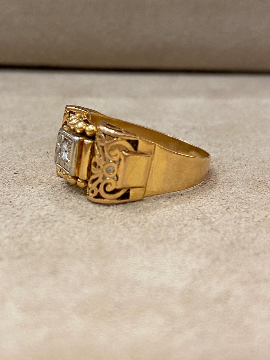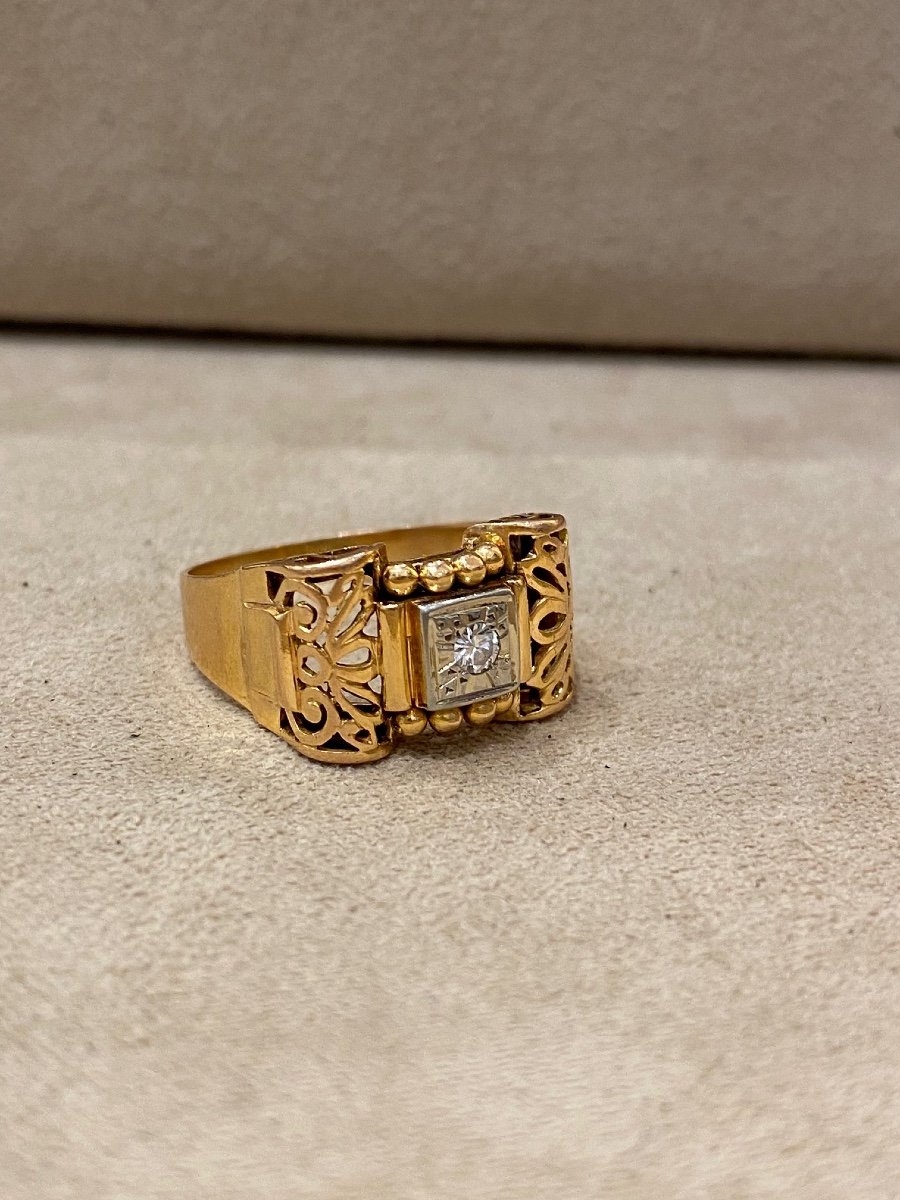 Délicate bague Tank modèle à pont en or jaune filigrané ornée en son centre d'un diamant taille brillant