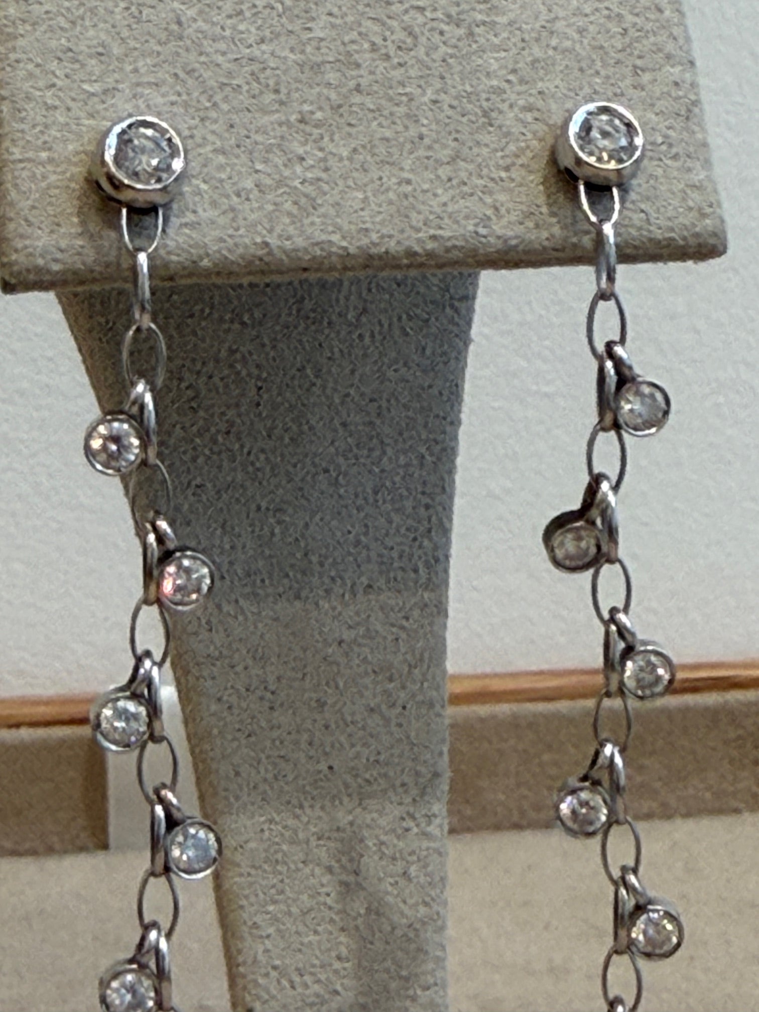 🇬🇧Modern white gold and diamond cascade earrings. These drop earrings feature 18 brilliant-cut diamonds in a bezel setting.