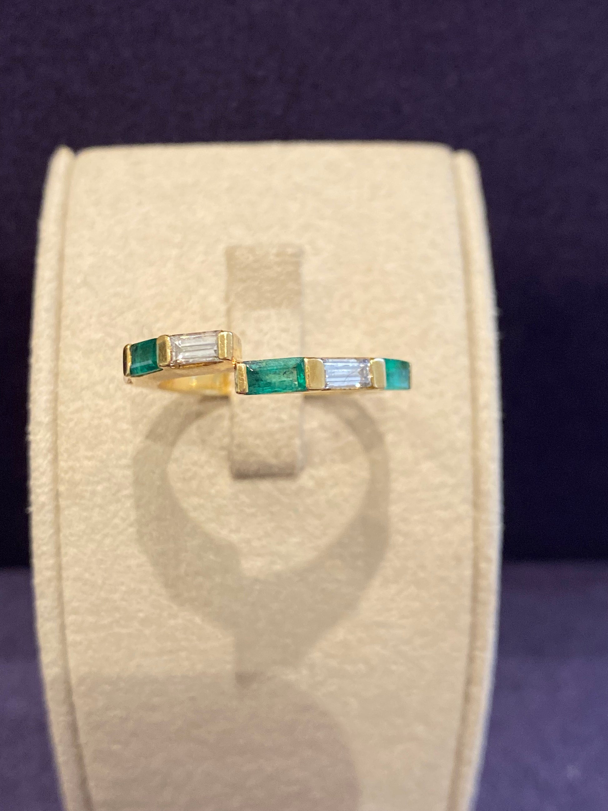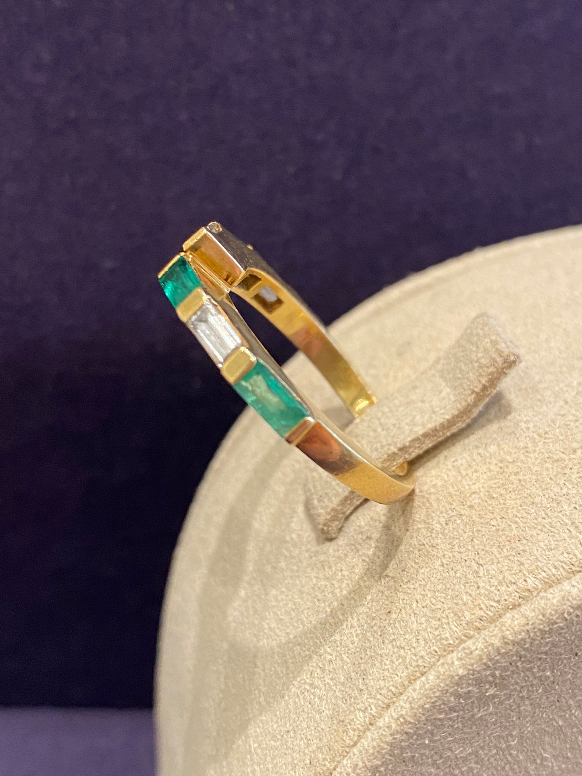 Demi alliance brisée en or jaune rythmée d'émeraudes et de diamants taille émeraude