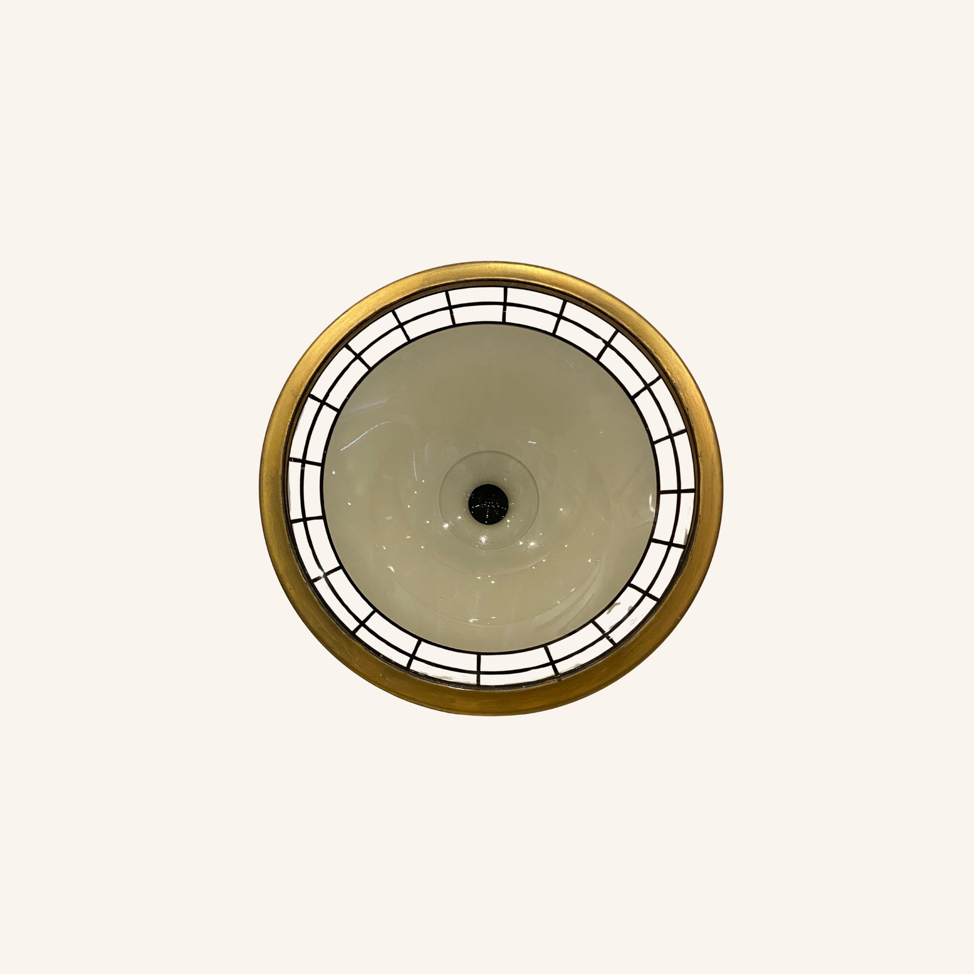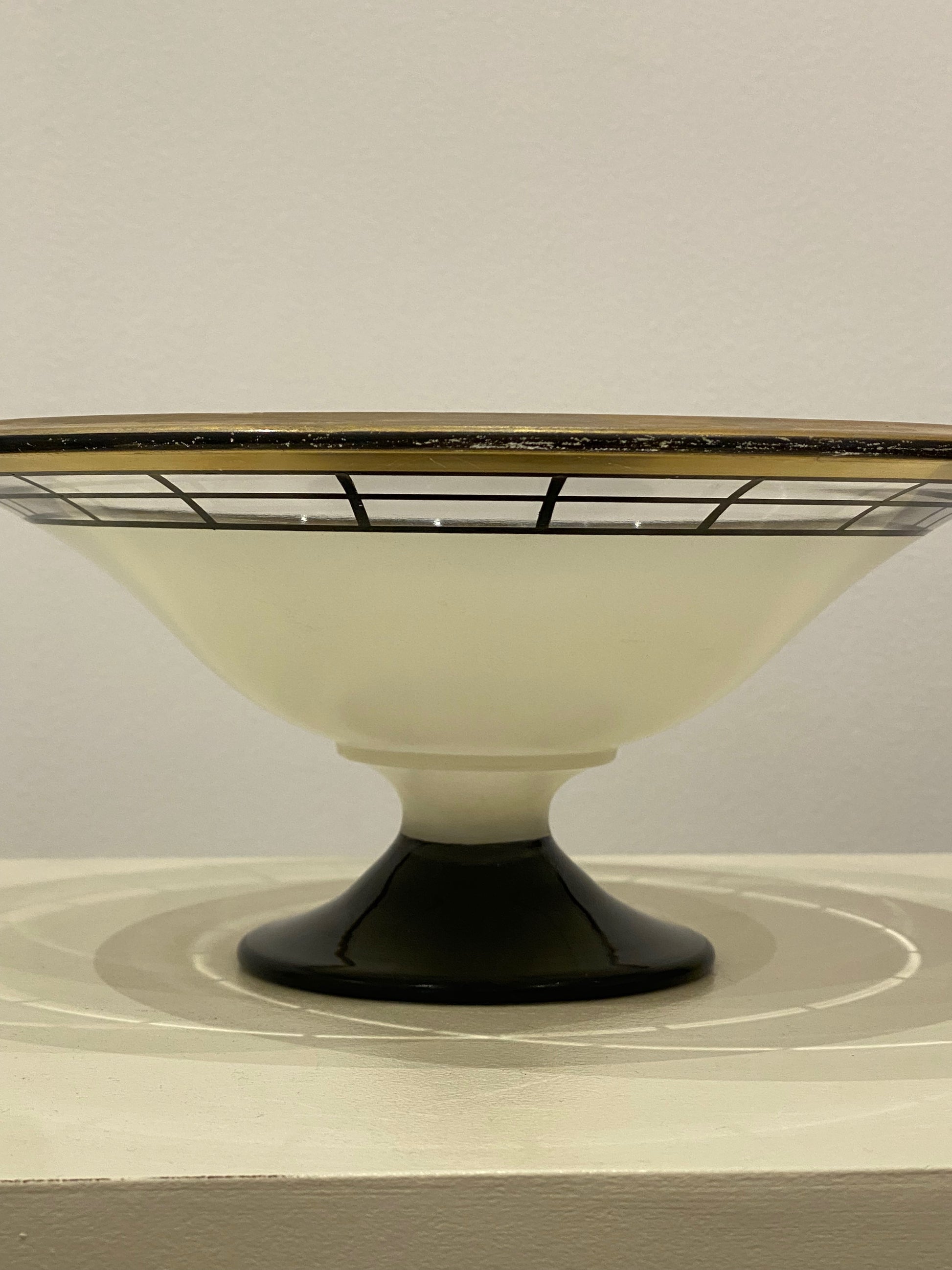 🇬🇧Superb Art Deco glass bowl by Westmoreland Glass Co. with black geometric patterns highlighted by a gold border.
